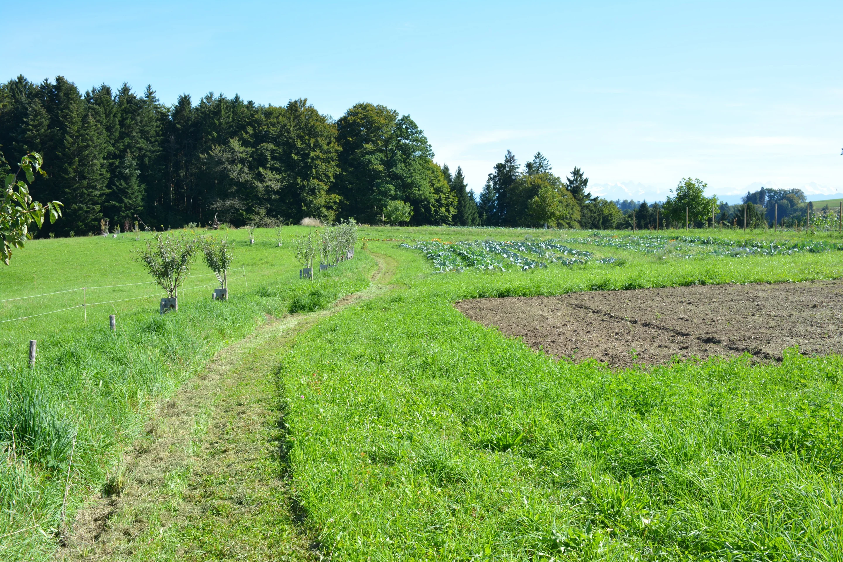 Wälle: Aus dem Aushubmaterial der Gräben werden flache Wälle geformt. Diese begrenzen die Gräben talwärts und erhöhen damit die Wasser-Retentionsmenge. Idealerweise werden die Wälle mit Gehölzen bepflanzt (Sträucher oder Bäume). Von den Sträuchern lassen sich Beeren gewinnen, die Bäume liefern Früchte und später wertvolles Holz. Gleichzeitig stabilisieren sie durch ihre Wurzeln den Hang und binden zusätzlich Wasser. Die Gehölze halten daneben auch noch Wind ab, beschatten die Ackerkulturen und sorgen mit der Verdunstung für Abkühlung.