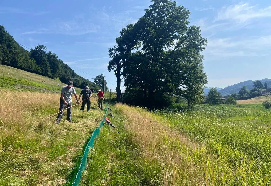 Die Handhabung einer Sense will gelernt sein. Im Pro Natura Schutzgebiet «Unteres Ried» am Rotsee in Ebikon erlernen wir ein altes Handwerk.